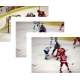 Jimmy Howard stretches to hold the post during a goalmouth scramble while Kris Newbury, Francis Pare, Jonathan Ericsson and Brett Lebda defend against Tim Kennedy in a preseason game against the Buffalo Sabres.