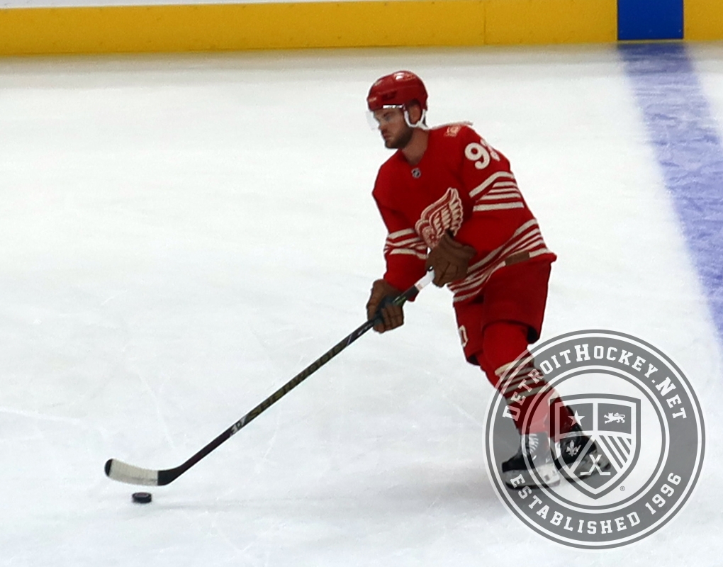 Alex DeBrincat of the Detroit Red Wings skates during pre-game warmups before a game against the Montreal Canadiens.