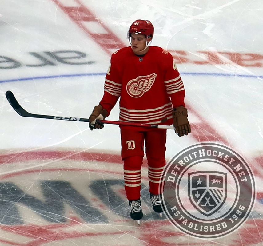 Axel Sandin-Pellikka of the Detroit Red Wings stands at center ice during pre-game warmups before a game against the Montreal Canadiens.
