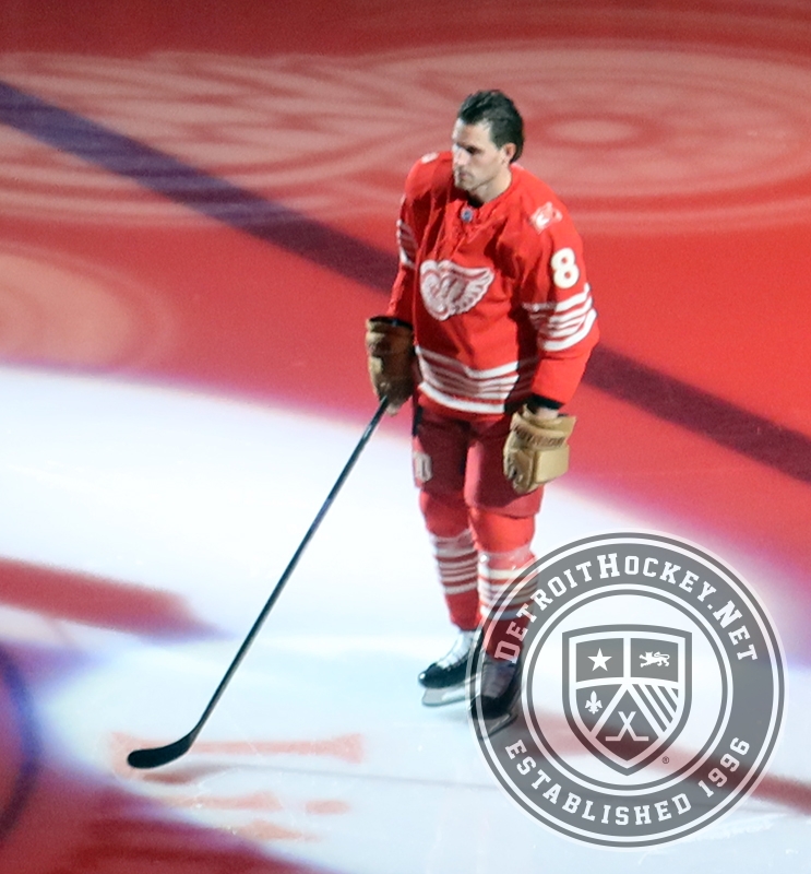 Ben Chiarot of the Detroit Red Wings skates out during player introductions before the team's home opener.