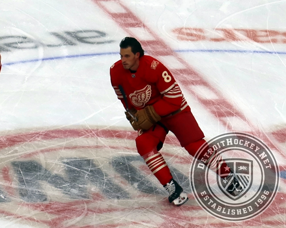 Ben Chiarot of the Detroit Red Wings skates at center ice during pre-game warmups before a game against the Montreal Canadiens.