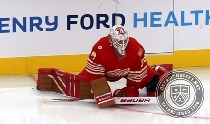 Cam Talbot of the Detroit Red Wings stretches near the boards during pre-game warmups before a game against the Montreal Canadiens.