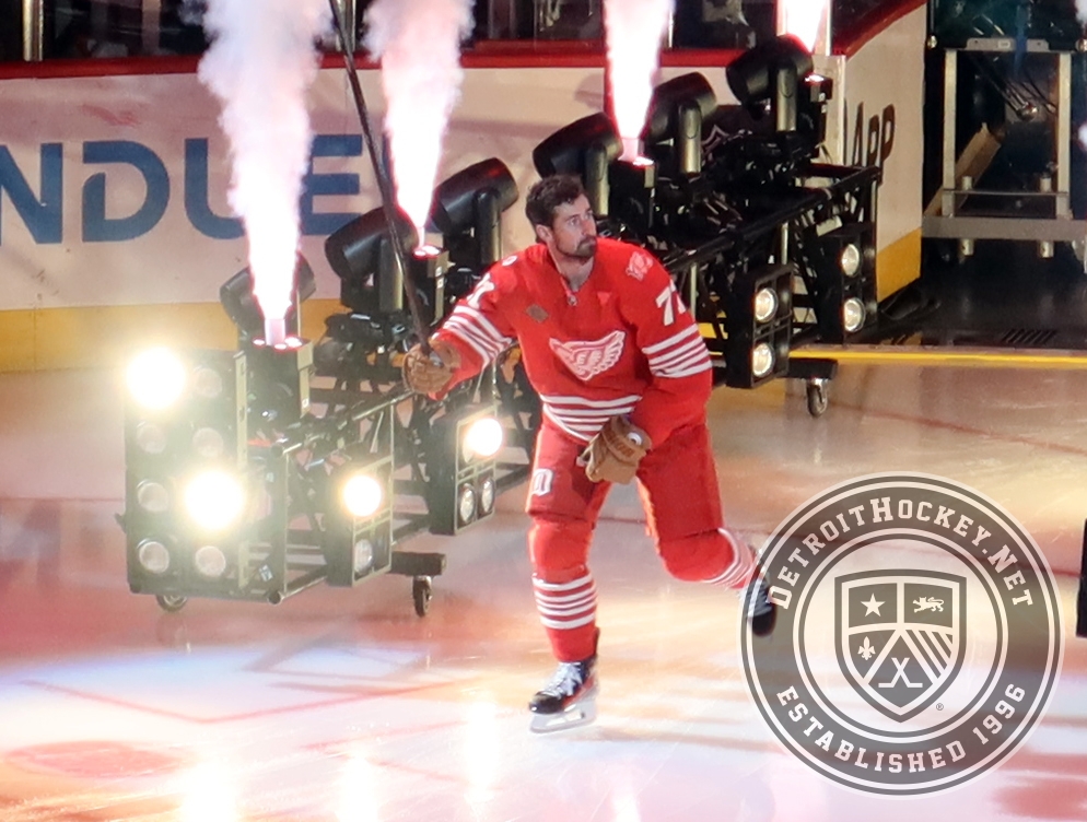 Dylan Larkin of the Detroit Red Wings skates out during player introductions before the team's home opener.