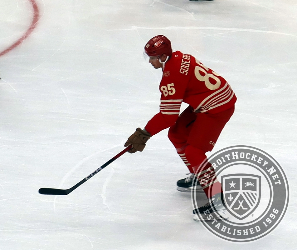 Elmer Soderblom of the Detroit Red Wings skates during pre-game warmups before a game against the Montreal Canadiens.