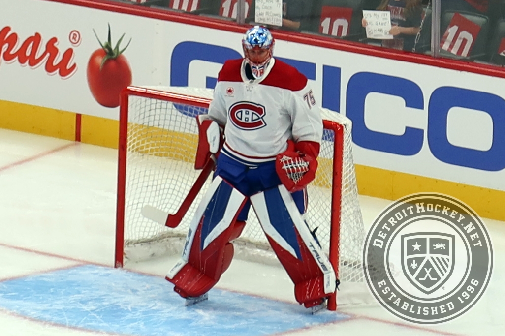 Jakub Dobes of the Montreal Canadiens stands in his crease during pre-game warmups before a game against the Detroit Red Wings.