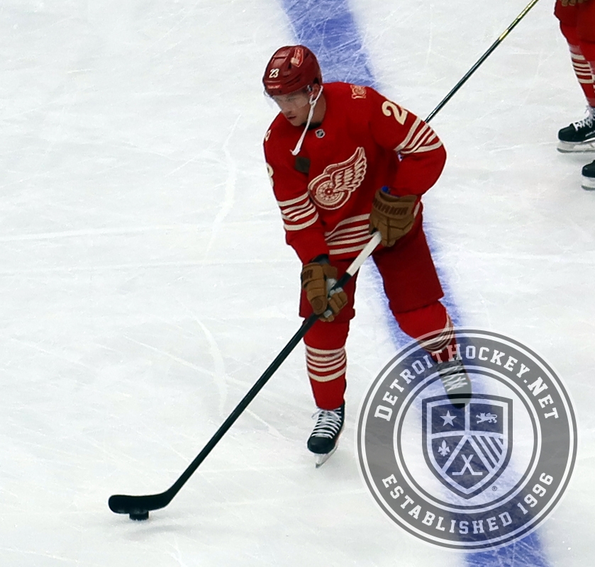Lucas Raymond of the Detroit Red Wings skates at the blue line during pre-game warmups before a game against the Montreal Canadiens.