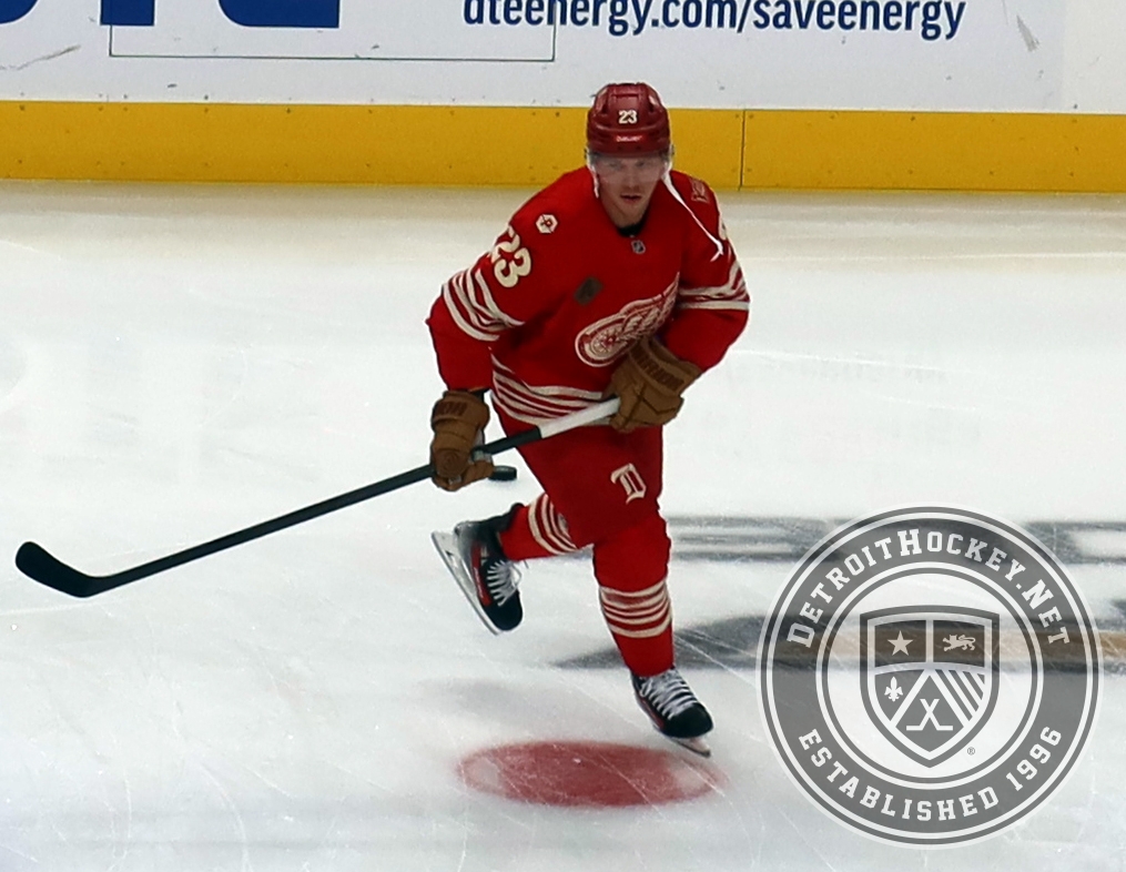 Lucas Raymond of the Detroit Red Wings skates in the neutral zone during pre-game warmups before a game against the Montreal Canadiens.
