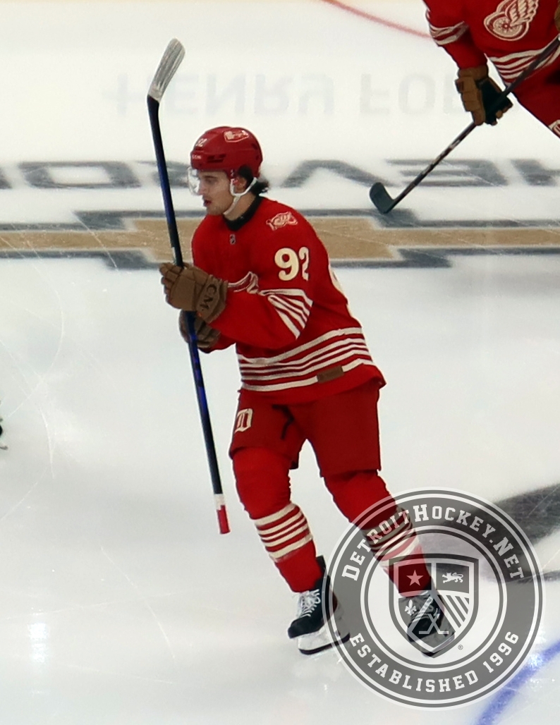 Marco Kasper of the Detroit Red Wings skates near center ice during pre-game warmups before a game against the Montreal Canadiens.