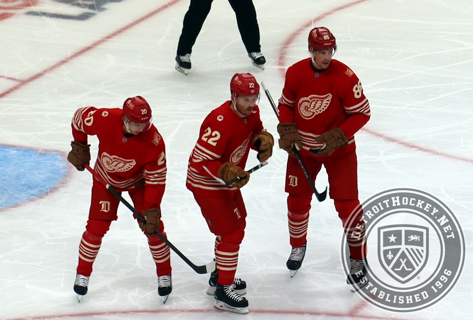 Albert Johansson, Mason Appleton, and Elmer Soderblom of the Detroit Red Wings get set for a faceoff during a game against the Montreal Canadiens.