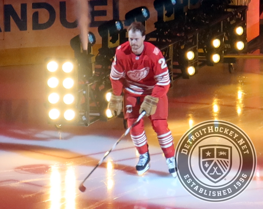 Mason Appleton of the Detroit Red Wings skates out during player introductions before the team's home opener.