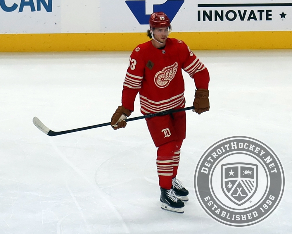 Moritz Seider of the Detroit Red Wings skates during pre-game warmups before a game against the Montreal Canadiens.