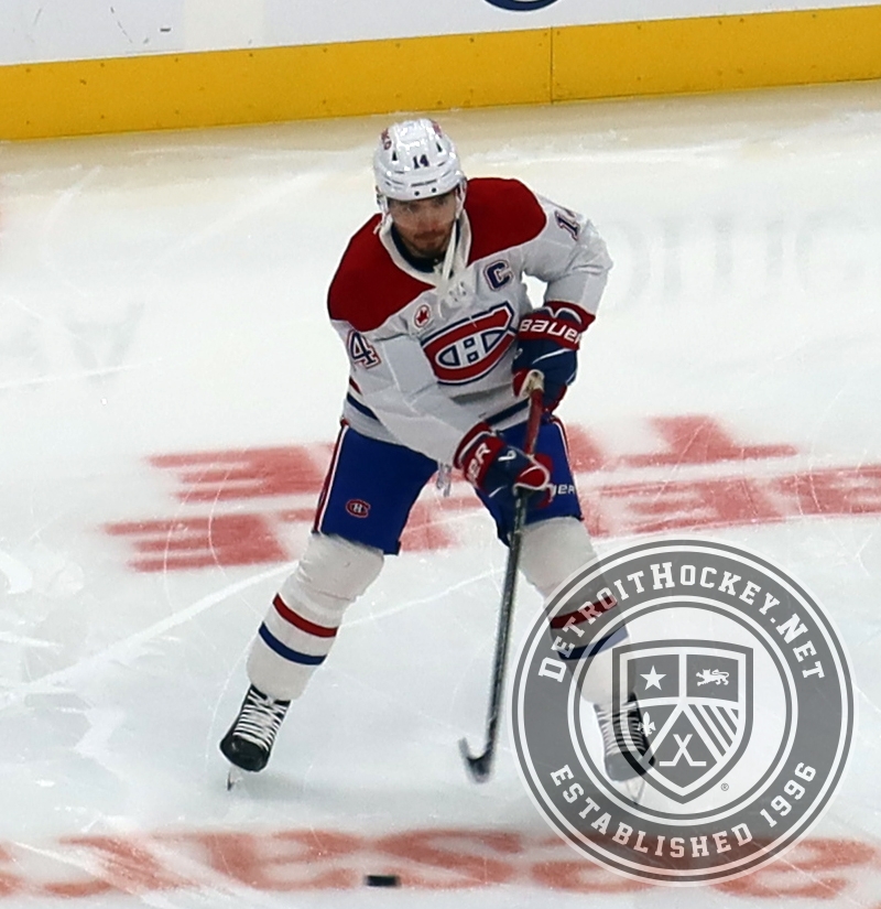 Nick Suzuki of the Montreal Canadiens skates in the neutral zone during pre-game warmups before a game against the Detroit Red Wings.