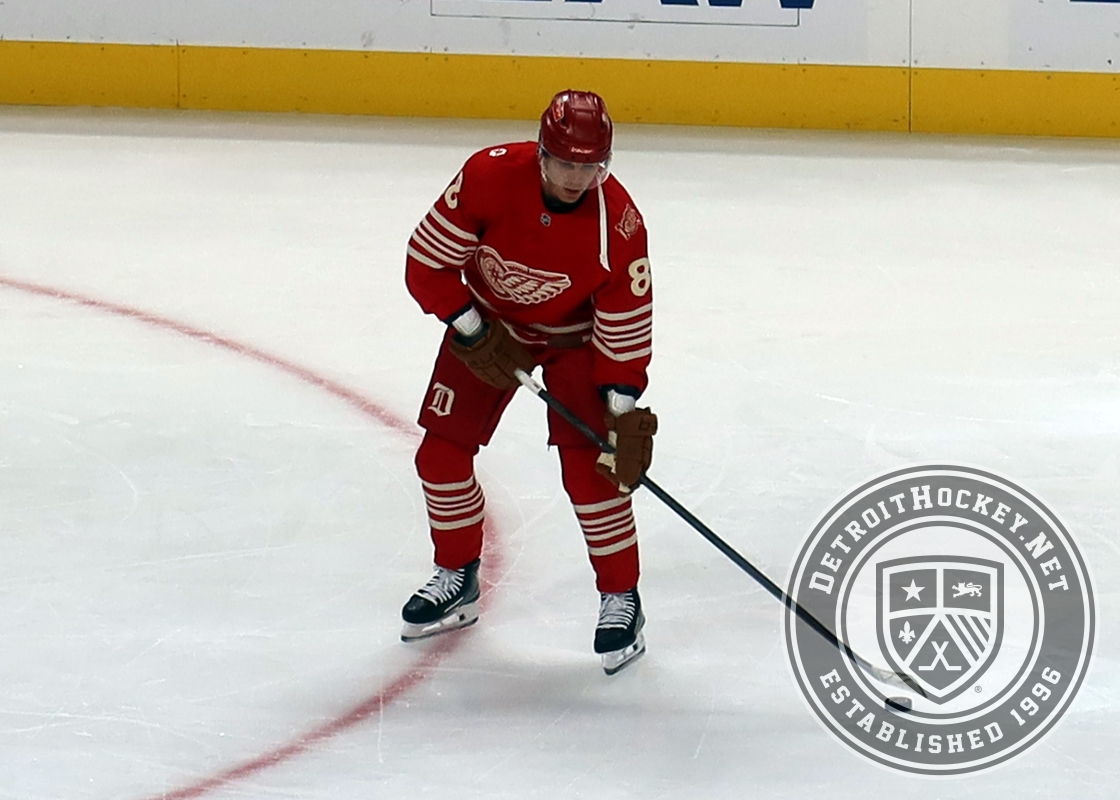 Patrick Kane of the Detroit Red Wings carries a puck during pre-game warmups before a game against the Montreal Canadiens.