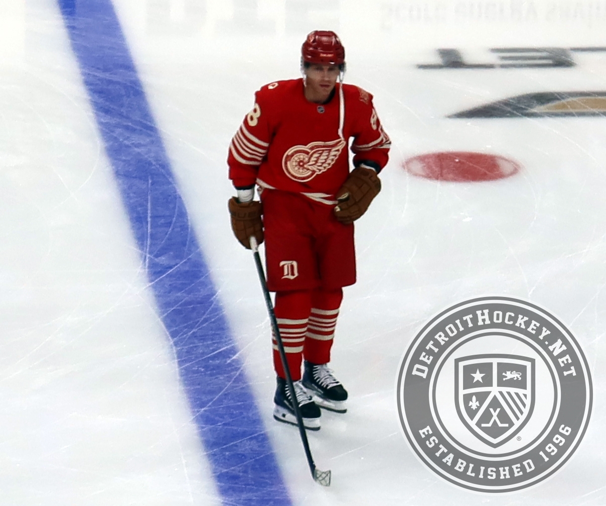 Patrick Kane of the Detroit Red Wings skates at the blue line during pre-game warmups before a game against the Montreal Canadiens.