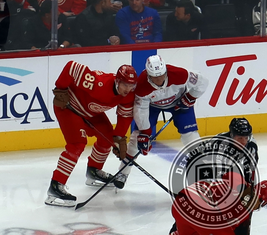 Elmer Soderblom of the Detroit Red Wings lines up at wing for a faceoff opposite Patrik Laine of the Montreal Canadiens.