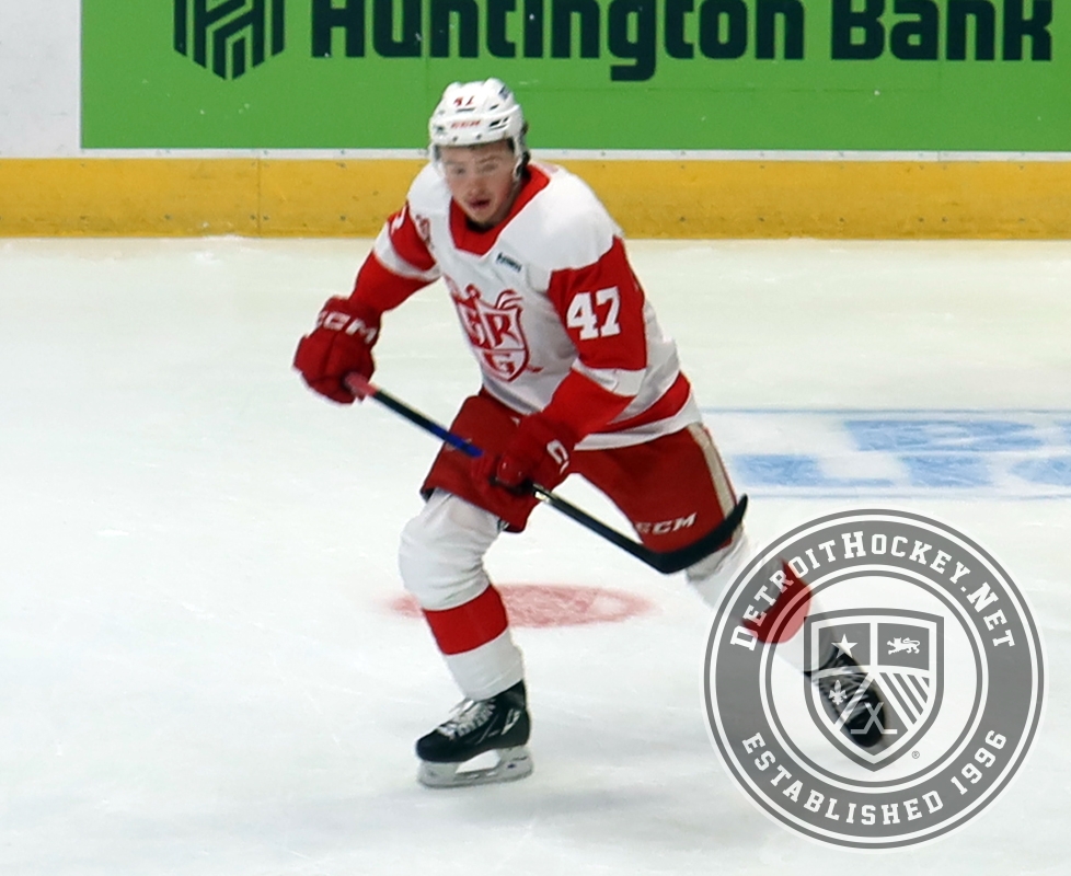 Alexandre Doucet of the Grand Rapids Griffins skates during pre-game warmups before a game against the Manitoba Moose.