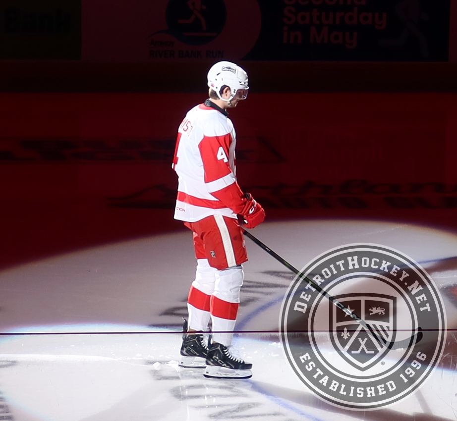Antti Tuomisto of the Grand Rapids Griffins skates out during player introductions before the team's home opener against the Manitoba Moose.