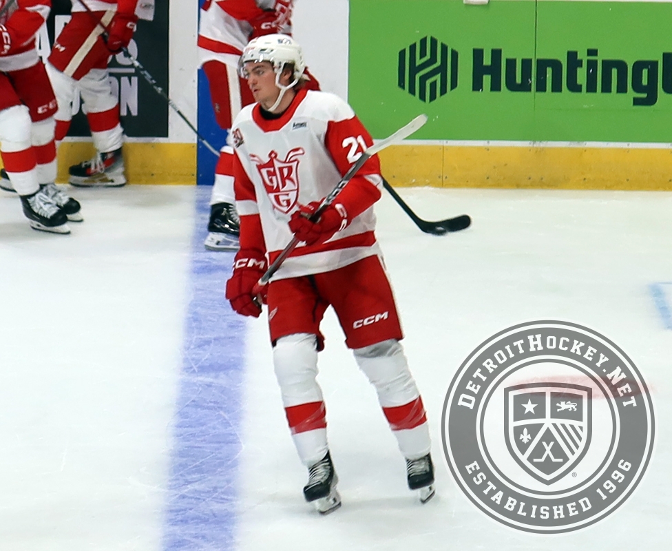 Carson Bantle of the Grand Rapids Griffins skates at the blue line during pre-game warmups before a game against the Manitoba Moose.