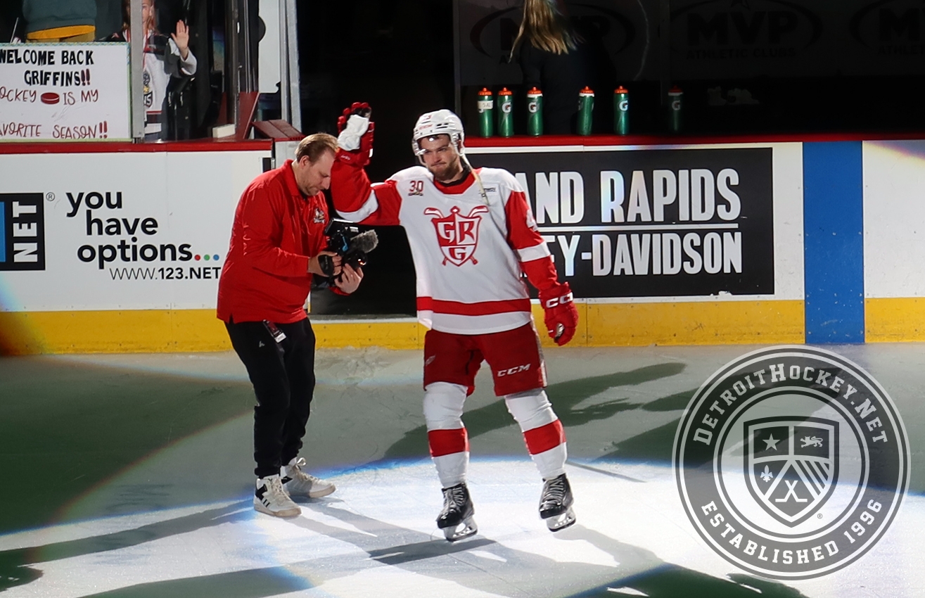Carter Mazur of the Grand Rapids Griffins salutes the crowd as the third star of a win over the Manitoba Moose.