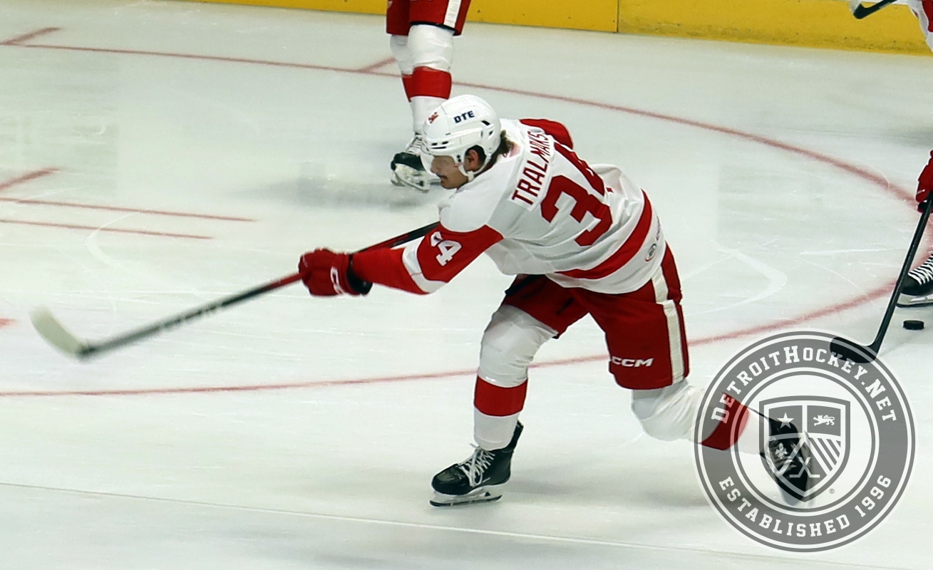 Eduards Tralmaks of the Grand Rapids Griffins fires a shot on goal during pre-game warmups before a game against the Manitoba Moose.