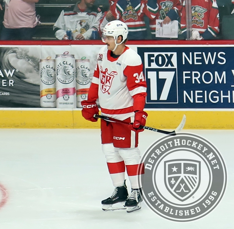 Eduards Tralmaks of the Grand Rapids Griffins skates near the boards during pre-game warmups before a game against the Manitoba Moose.