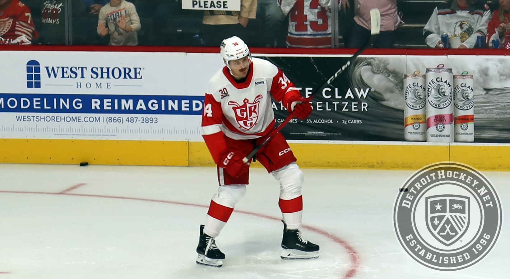 Eduards Tralmaks of the Grand Rapids Griffins winds up for a shot during pre-game warmups before a game against the Manitoba Moose.