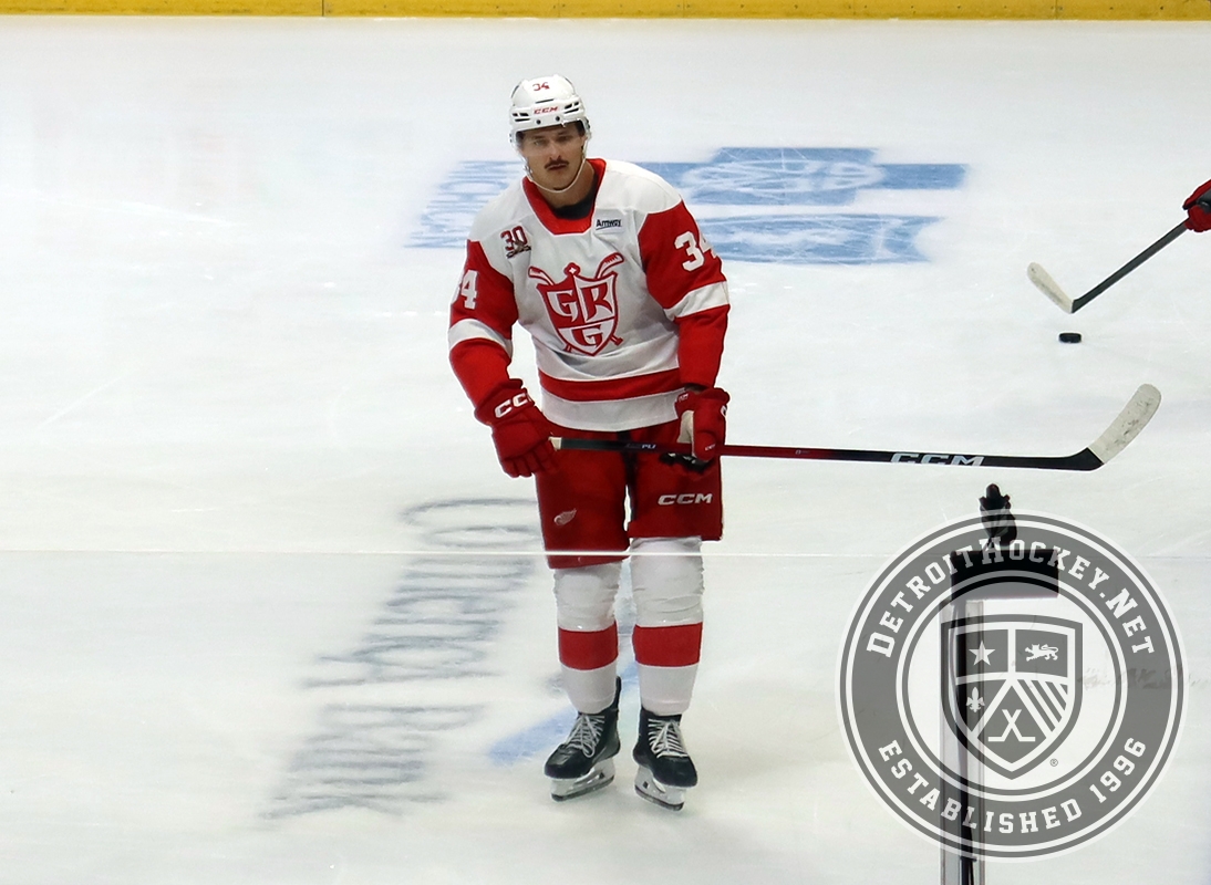 Eduards Tralmaks of the Grand Rapids Griffins skates during pre-game warmups before a game against the Manitoba Moose.