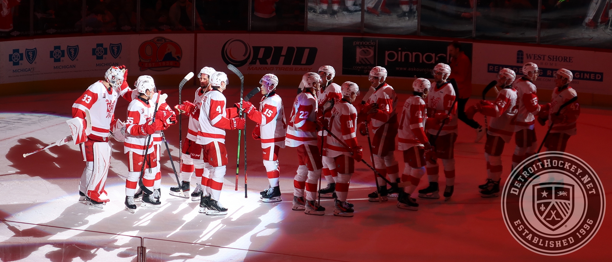 The Grand Rapids Griffins stream onto the ice to celebrate a win over the Manitoba Moose.