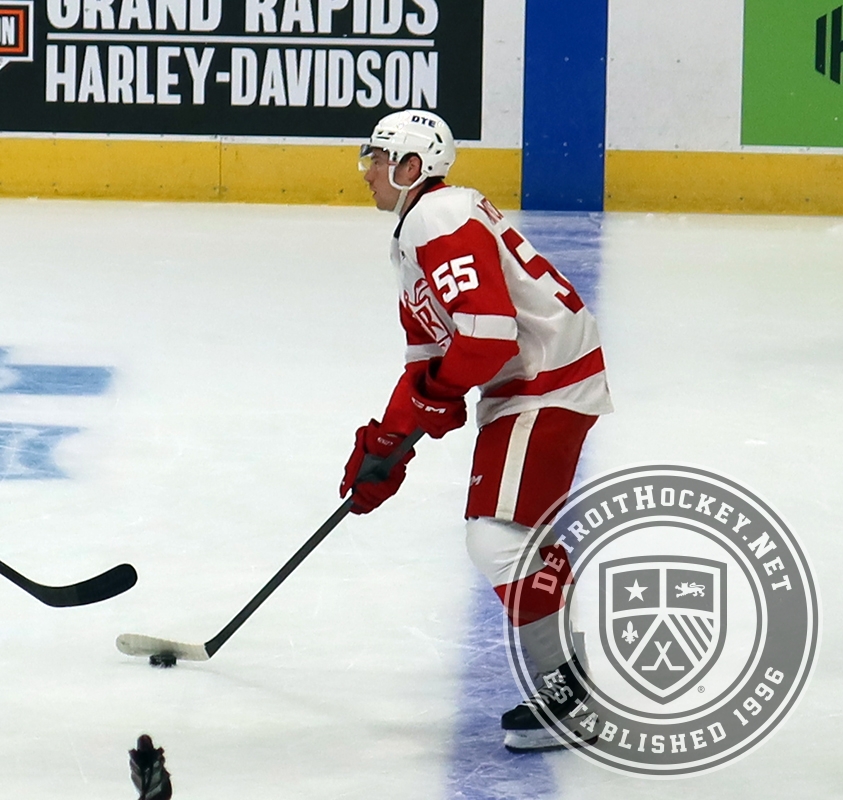 Ian Mitchell of the Grand Rapids Griffins skates across the blue line during pre-game warmups before a game against the Manitoba Moose.
