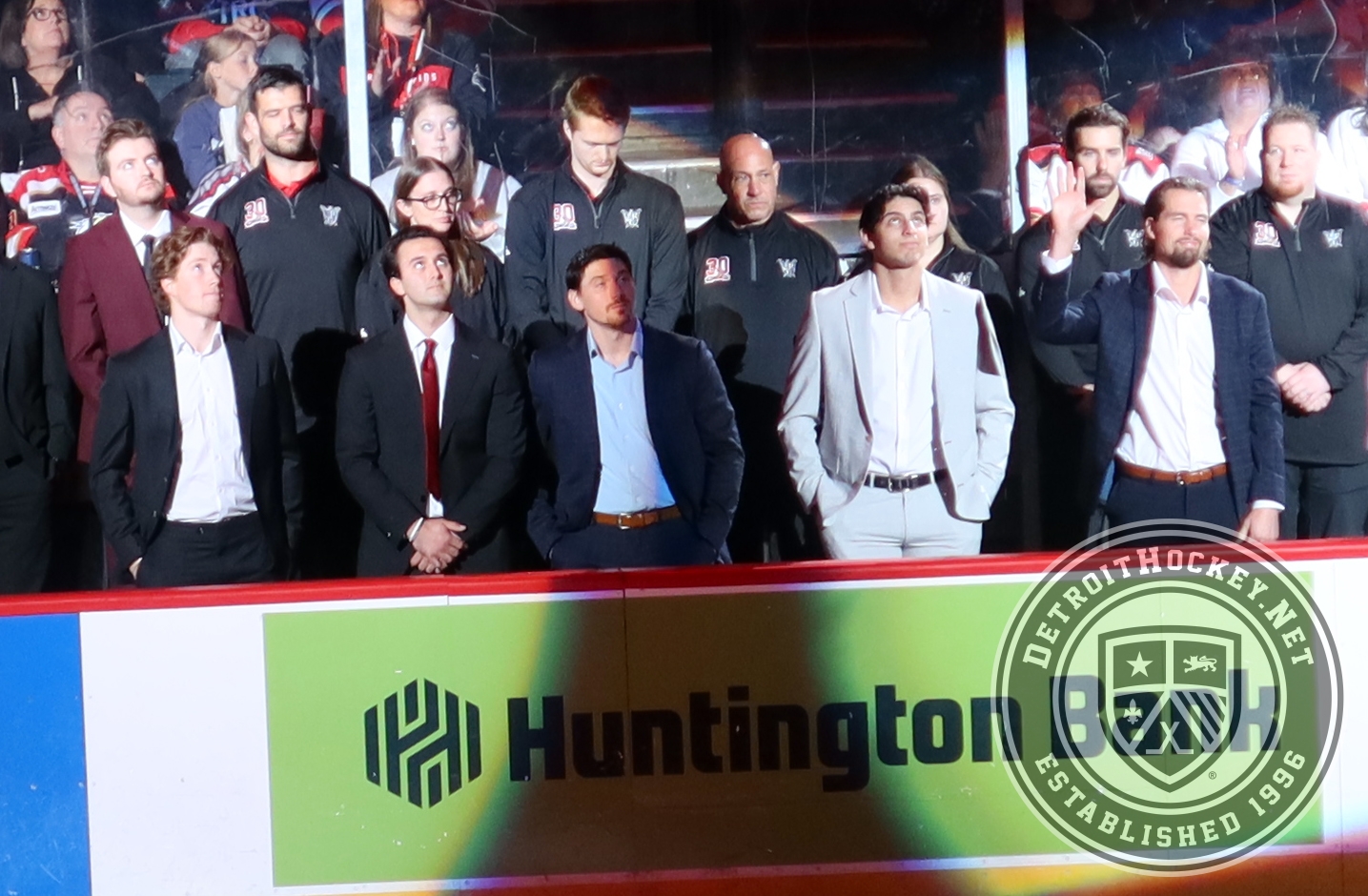 Grand Rapids Griffins Nate Danielson, Jacob Truscott, John Leonard, Shai Buium, and Justin Holl stand at the bench while being introduced as scratches before the team's home opener against the Manitoba Moose.