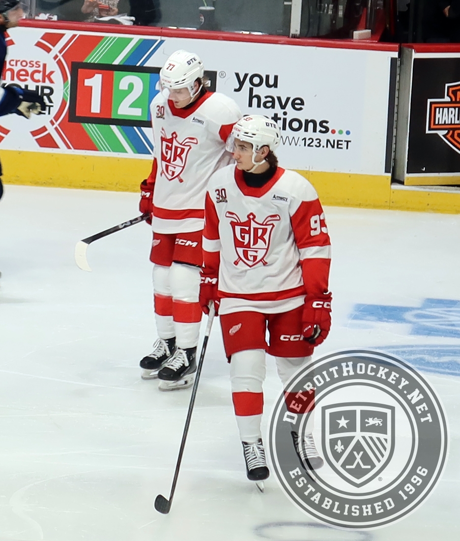 Tyler Angle and Amadeus Lombardi of the Grand Rapids Griffins skate away from the bench during a stop in play in a game against the Manitoba Moose.