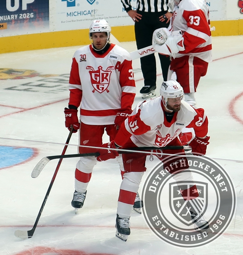 William Lagesson and Austin Watson of the Grand Rapids Griffins get ready for a faceoff during a game against the Manitoba Moose.