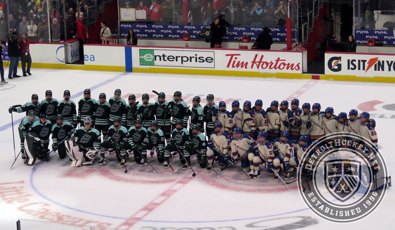 The Boston Fleet and Vancouver Goldeneyes pose at center ice for a group photo after the PWHL Takeover Tour Detroit game.