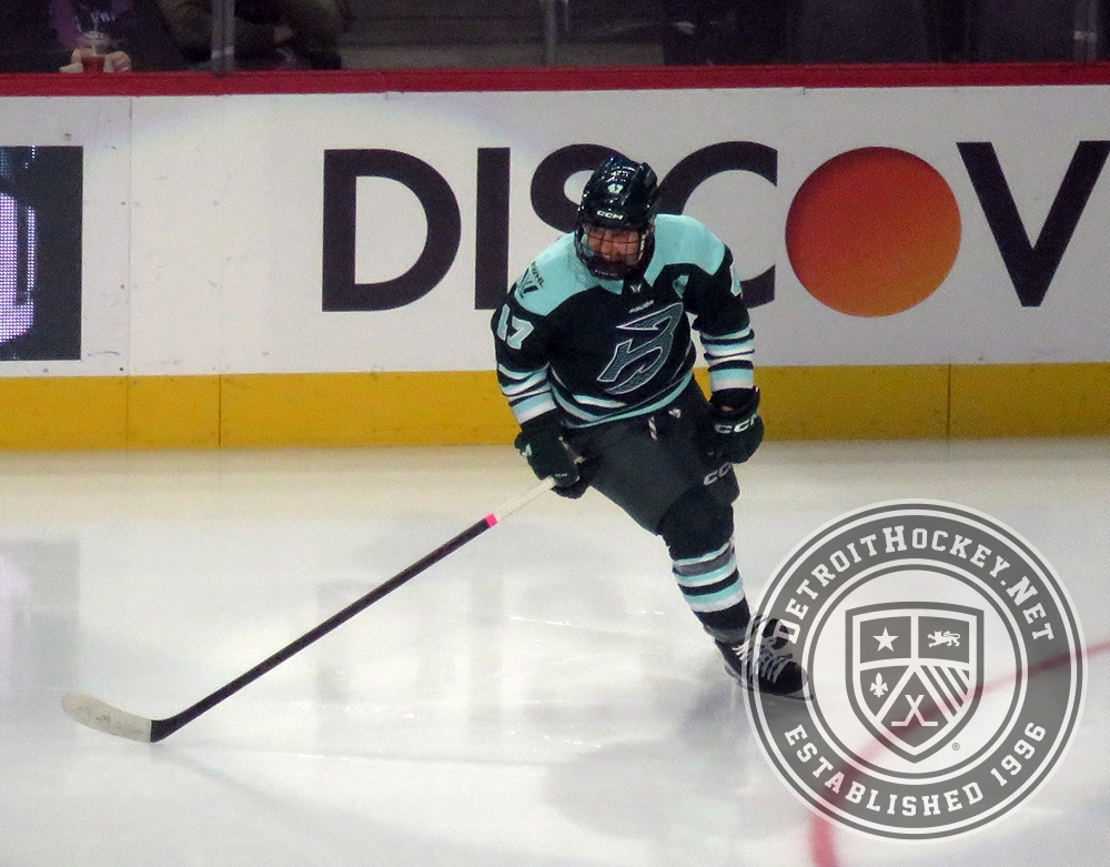 Jamie Lee Rattray of the Boston Fleet celebrates a goal during the PWHL Takeover Tour Detroit game against the Vancouver Goldeneyes.