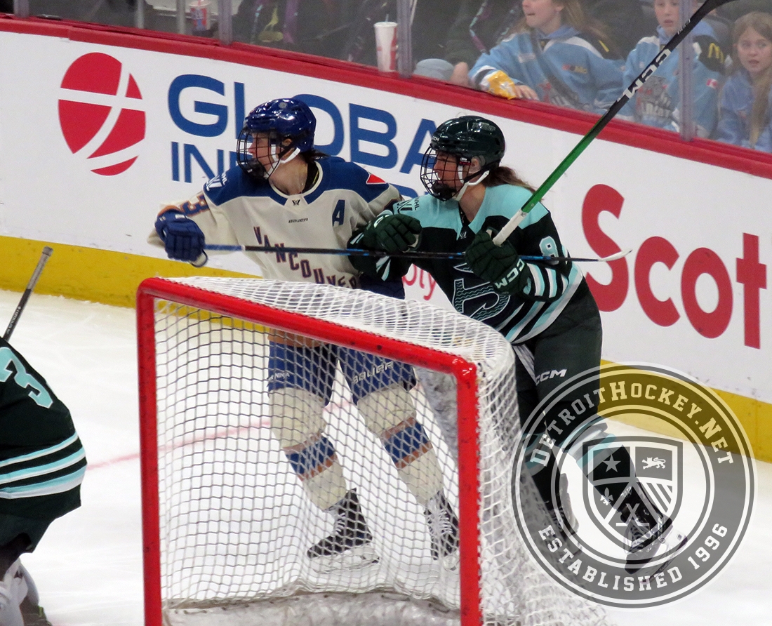 Michelle Karvinen of the Vancouver Goldeneyes and Haley Winn of the Boston Fleet battle for position behind the Boston net during the PWHL Takeover Tour Detroit game.