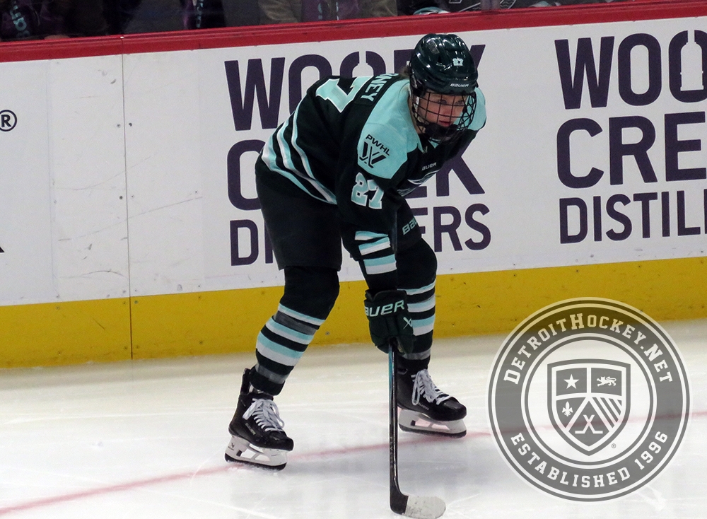 Shay Maloney of the Boston Fleet lines up for a faceoff during the PWHL Takeover Tour Detroit game against the Vancouver Goldeneyes.