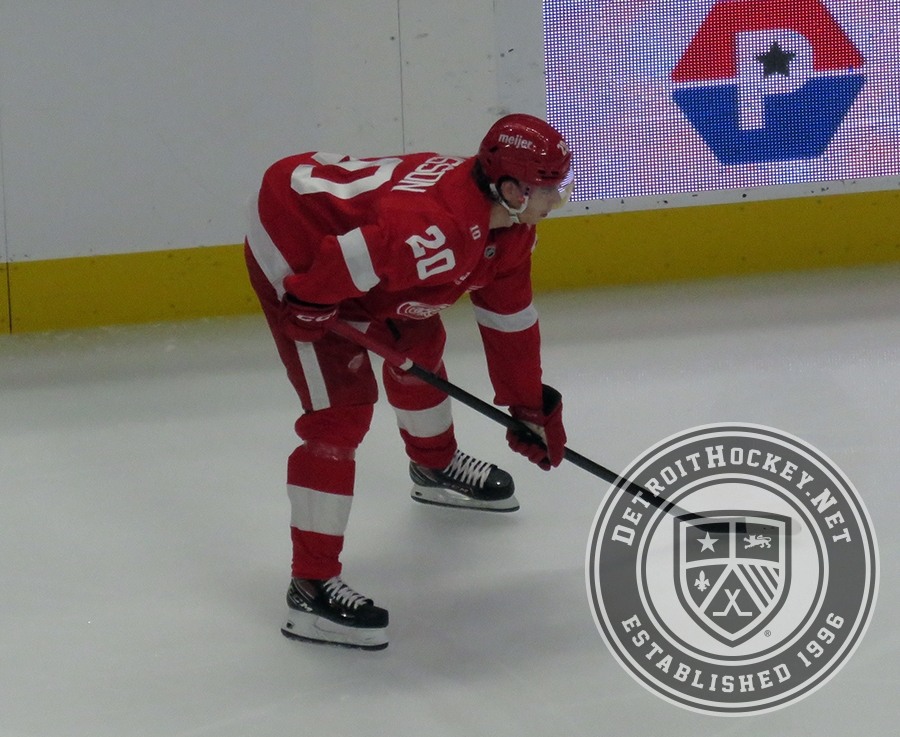 Albert Johansson of the Detroit Red Wings gets set for a faceoff during a game against the Carolina Hurricanes.