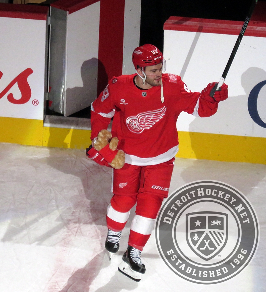 Alex DeBrincat of the Detroit Red Wings steps onto the ice as the second star of a game against the Carolina Hurricanes.