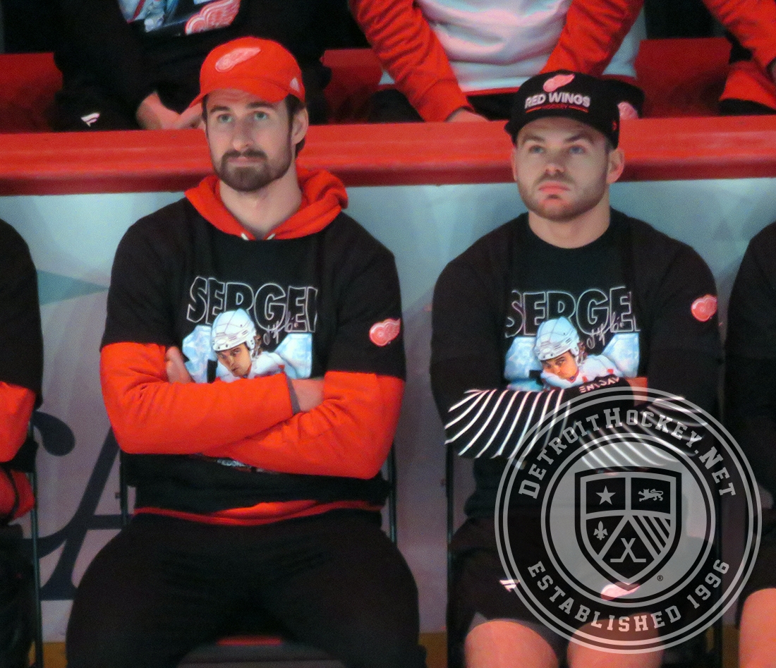 Dylan Larkin and Alex DeBrincat watch Sergei Fedorov speak during Fedorov's jersey retirement ceremony.