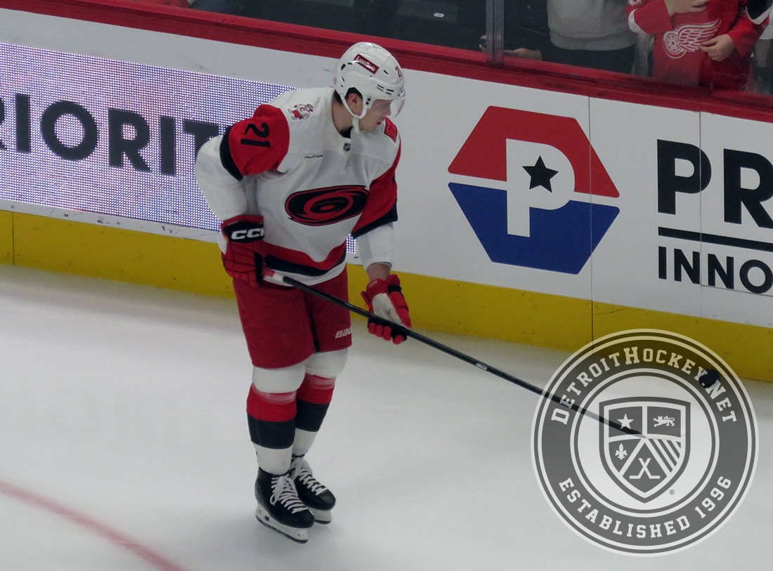 Alexander Nikishin of the Carolina Hurricanes stands at the bench during pre-game warmups before a game against the Detroit Red Wings.
