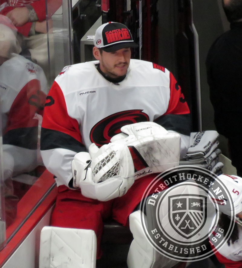 Carolina Hurricanes' backup goalie Brandon Bussi sits at the bench during a game against the Detroit Red Wings.