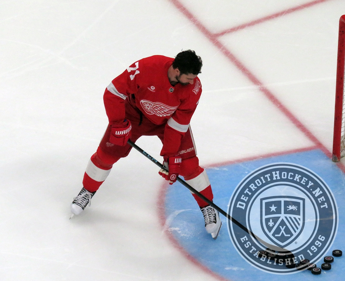 Dylan Larkin of the Detroit Red Wings clears pucks from the crease during pre-game warmups before a game against the Carolina Hurricanes, wearing a customized Sergei Fedorov jersey and white skates in honor of Fedorov's jersey retirement.