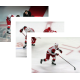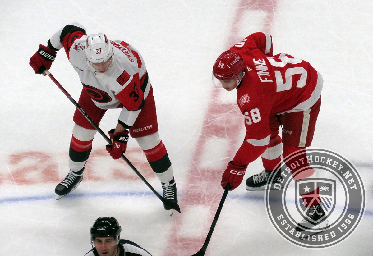 Andrei Svechnikov of the Carolina Hurricanes and Emmitt Finnie of the Detroit Red Wings line up at wing for a faceoff.