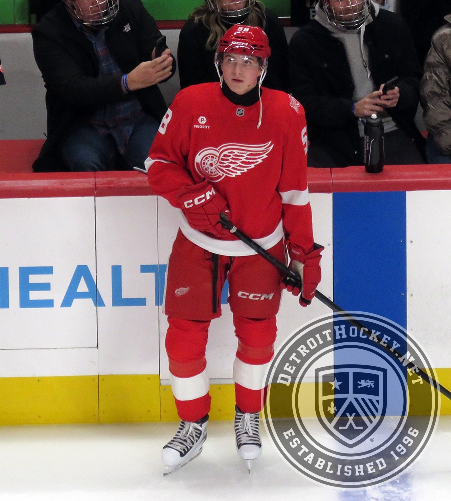 Emmitt Finnie of the Detroit Red Wings stands at the bench during pre-game warmups before a game against the Carolina Hurricanes, wearing a customized Sergei Fedorov jersey and white skates in honor of Fedorov's jersey retirement.