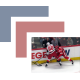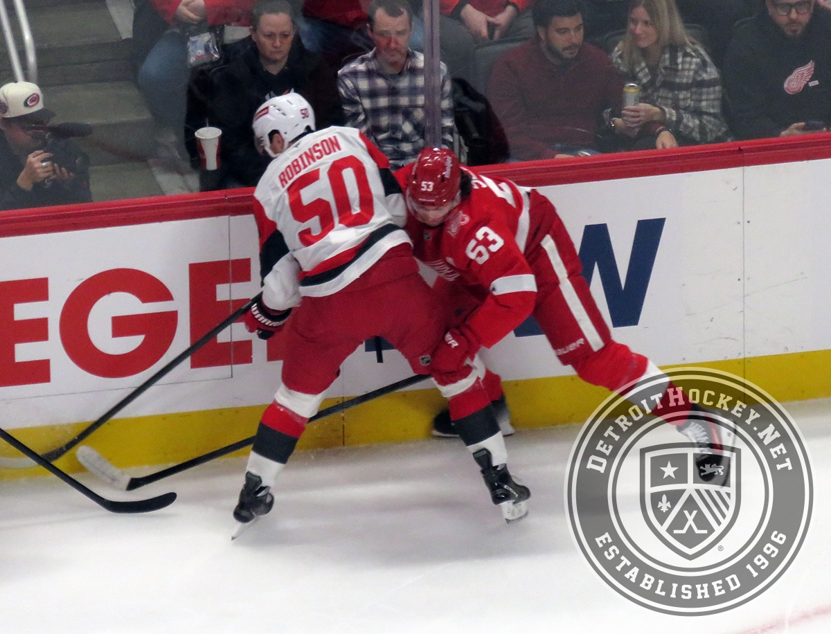 Eric Robinson of the Carolina Hurricanes and Moritz Seider of the Detroit Red Wings battle along the boards.