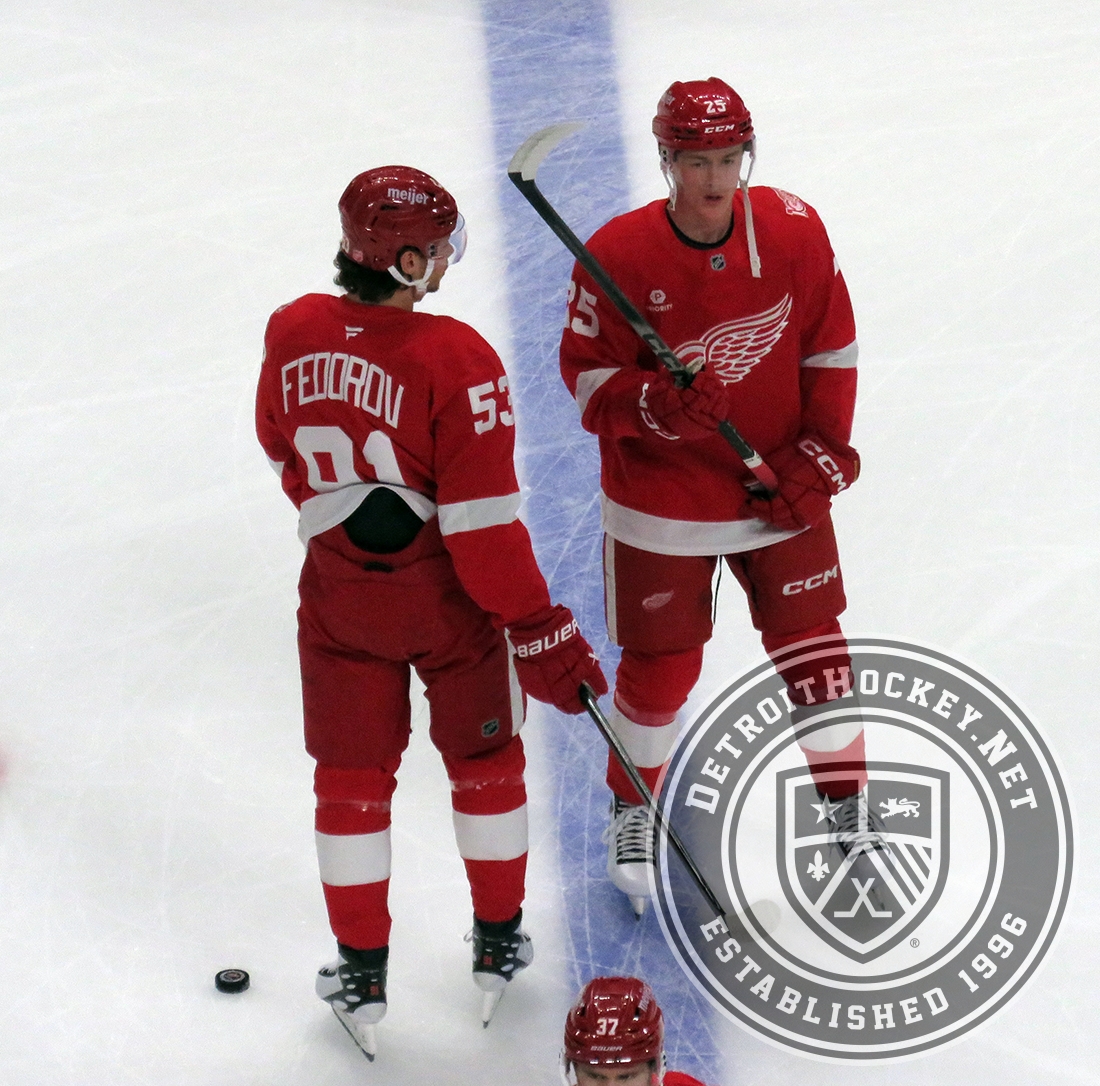 Moritz Seider and Jacob Bernard-Docker of the Detroit Red Wings stand at the blue line during pre-game warmups before a game against the Carolina Hurricanes, wearing customized Sergei Fedorov jerseys and white skates in honor of Fedorov's jersey retirement.