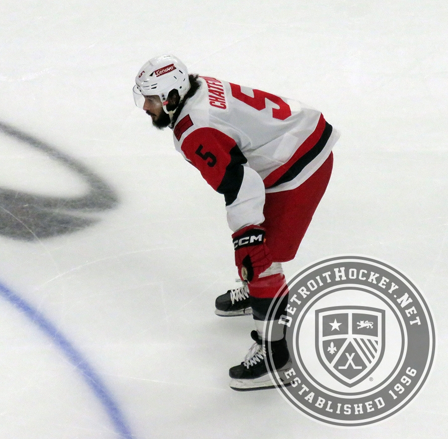 Jalen Chatfield of the Carolina Hurricanes gets set for a faceoff during a game against the Detroit Red Wings.