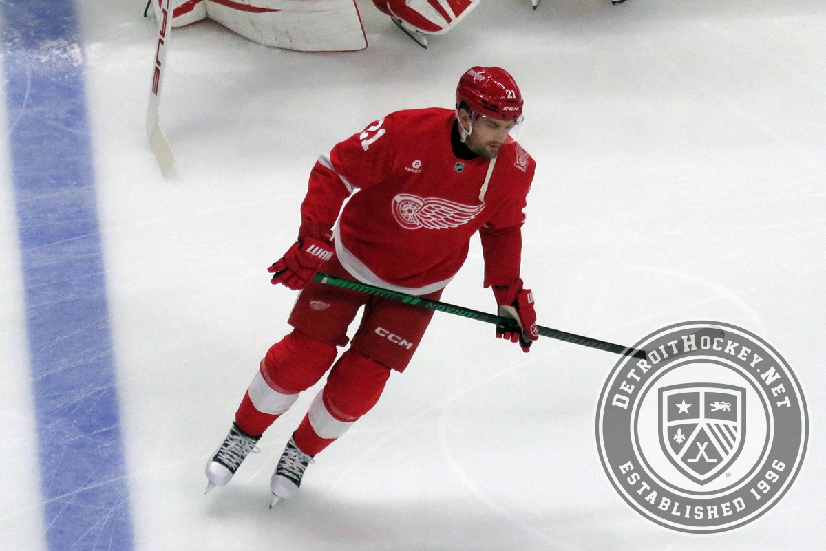 James van Riemsdyk of the Detroit Red Wings skates at the blue line during pre-game warmups before a game against the Carolina Hurricanes, wearing a customized Sergei Fedorov jersey and white skates in honor of Fedorov's jersey retirement.