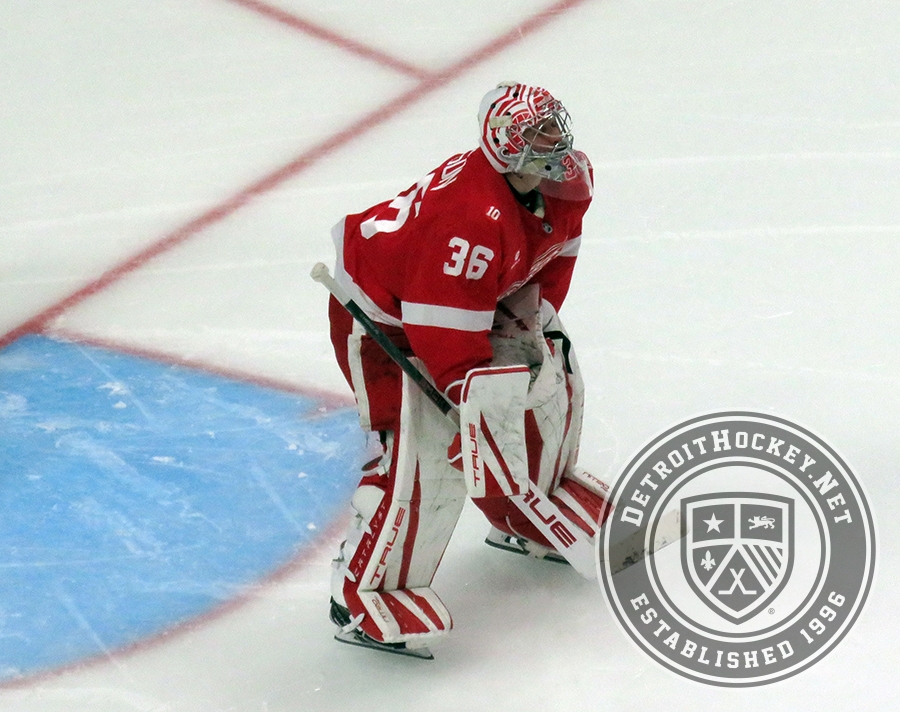 John Gibson of the Detroit Red Wings sets up at the top of his crease at the start of the second period of a game against the Carolina Hurricanes.