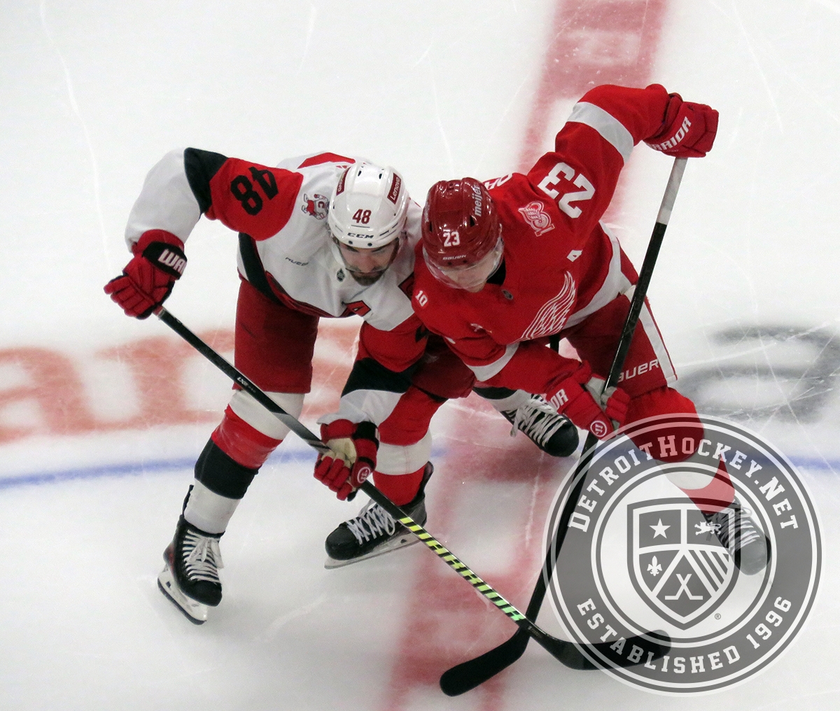 Jordan Martinook of the Carolina Hurricanes and Lucas Raymond of the Detroit Red Wings line up at wing for a faceoff.